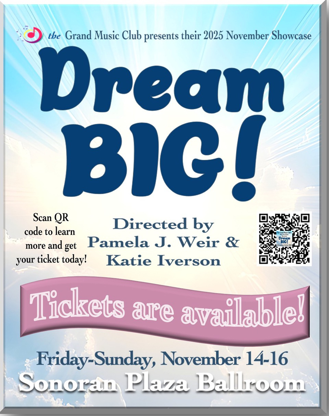 The Grand Music Club is composed of Grand residents who share a love of music. Its activities give members performance opportunities as singers and instrumentalists, both singly and in groups. Members also participate in production, technical, and backstage activities for our shows and support the club through Board and committee functions.
